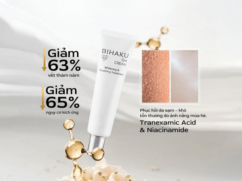 BIHAKU Gel Cream là sản phẩm dưỡng trắng chuyên sâu, giúp làm sáng da từ sâu bên trong, giảm nám rõ rệt, đồng thời phục hồi da đang bị tổn thương do ánh nắng. Nhờ vào các thành phần Tranexamic Acid 3% kết hợp Niacinamide 10% trong màng bọc Encapsulate. Ngoài ra kem còn được bổ sung Chiết xuất Oải hương trắng Misato Sekka quý hiếm có khả năng kháng viêm, phục hồi làm dịu da, giảm cảm giác nóng rát và sạm màu sau khi tiếp xúc với ánh nắng mặt trời.